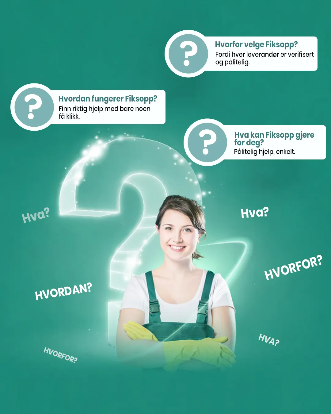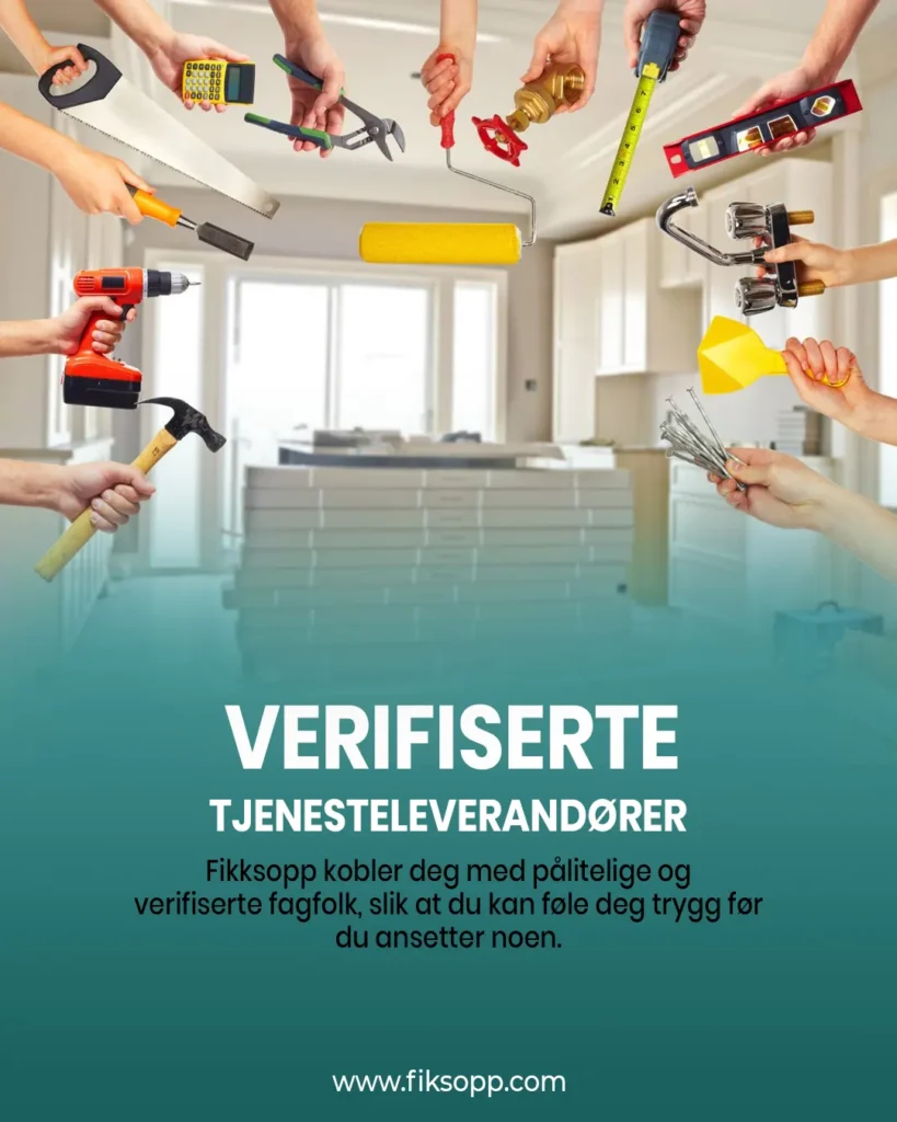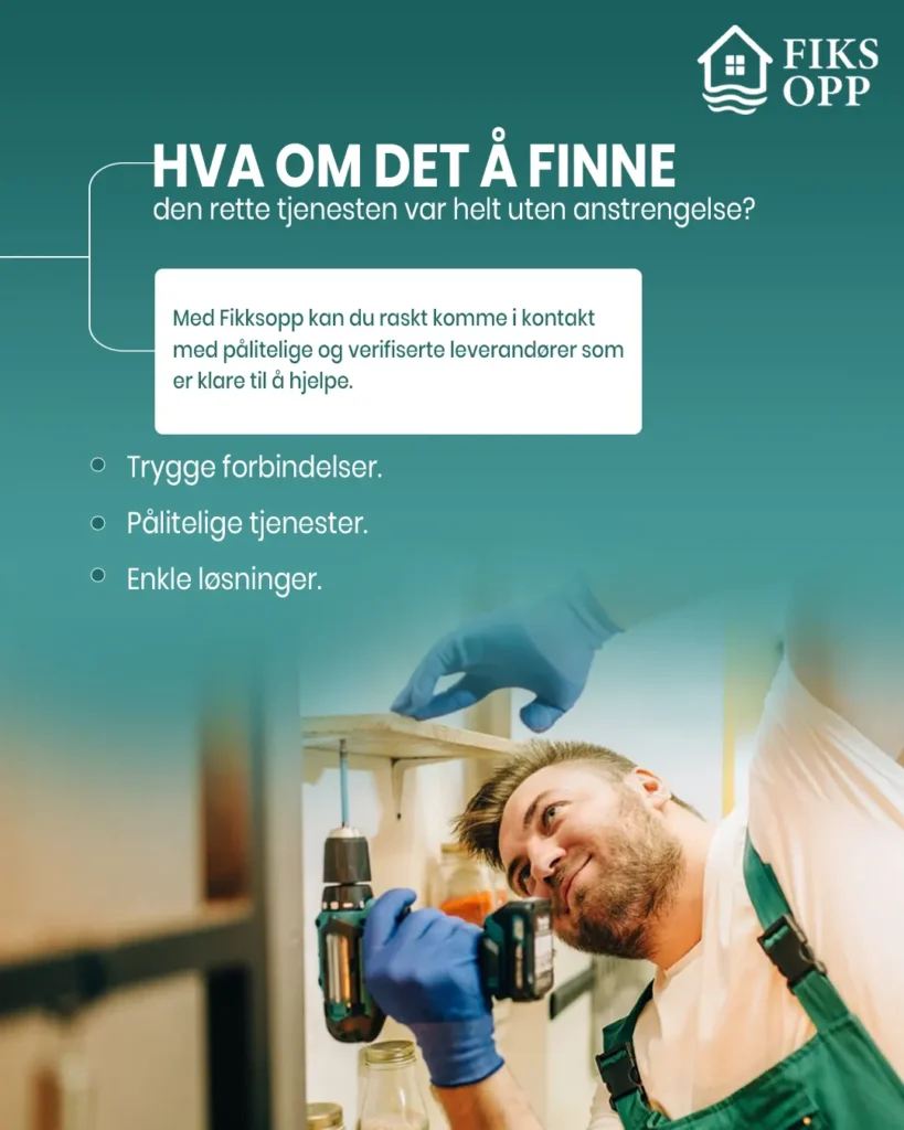 Fiksopp gjør det enkelt, raskt og pålitelig å få småjobber utført. Hver arbeider på plattformen vår er verifisert og har dokumentert erfaring, så du kan være trygg på at oppgaven blir utført profesjonelt. Med fleksibel tidsplan, gjennomsiktig pris og enkel kommunikasjon sørger Fiksopp for en sømløs opplevelse både for de som legger ut jobber og for arbeiderne.